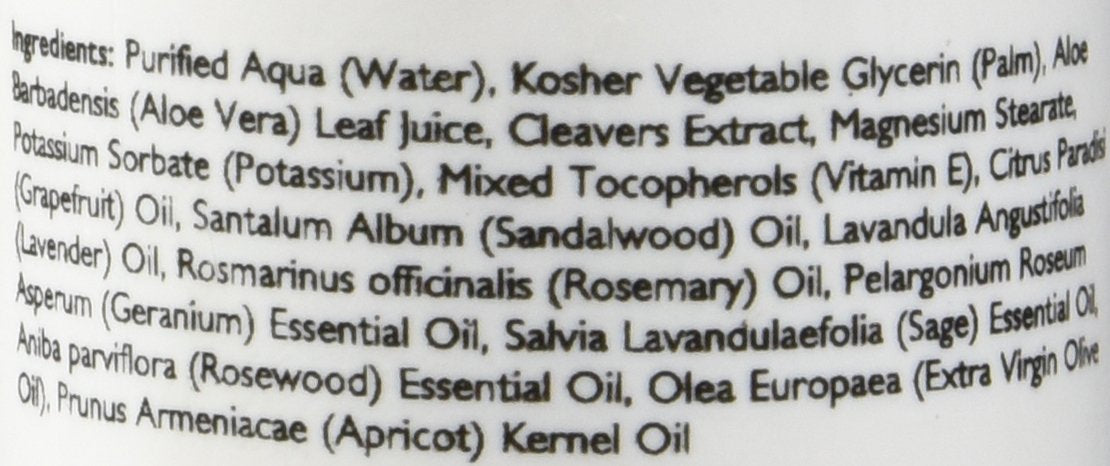 Purified Aqua (Water), Kosher Vegetable Glycerin (Palm), Aloe Barbadensis (Aloe Vera) Leaf Juice*, Cleavers Extract*, Magnesium Stearate, Potassium Sorbate (Potassium), Mixed Tocopherols, Citrus Paradisi (Grapefruit) Oil*, Santalum Album (Sandalwood) Oil*, Lavandula Angustifolia (Lavender) Oil*, Rosmarinus officinalis (Rosemary) Oil*, Pelargonium Roseum Asperum (Geranium) Essential Oil*, Salvia Lavandulaefolia (Sage) Essential Oil*, Aniba parviflora (Rosewood) Essential Oil*, Olea Europaea (Extra Virgin Olive Oil)*, Prunus Armeniacae (Apricot) Kernel Oil*
